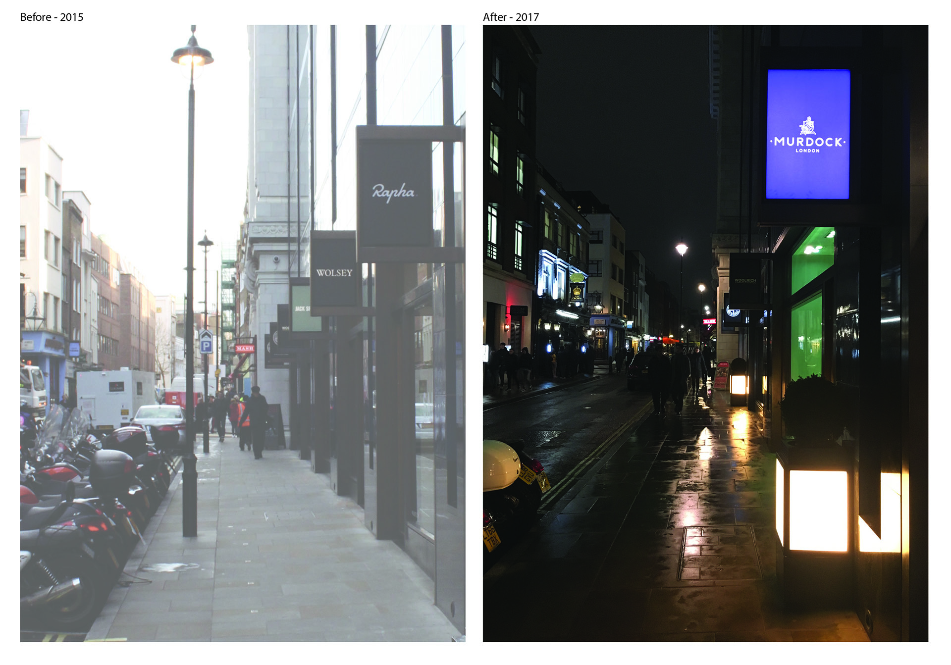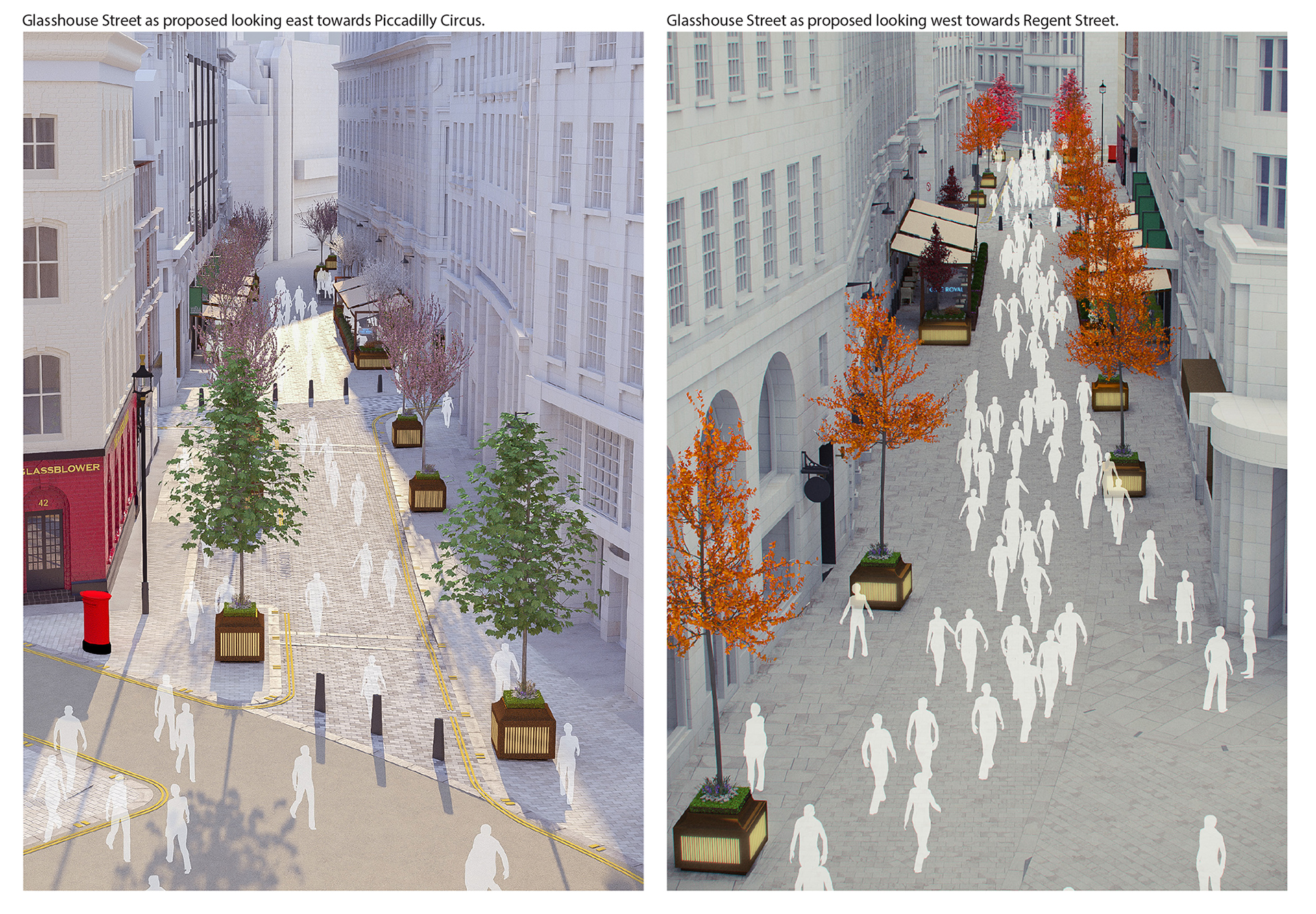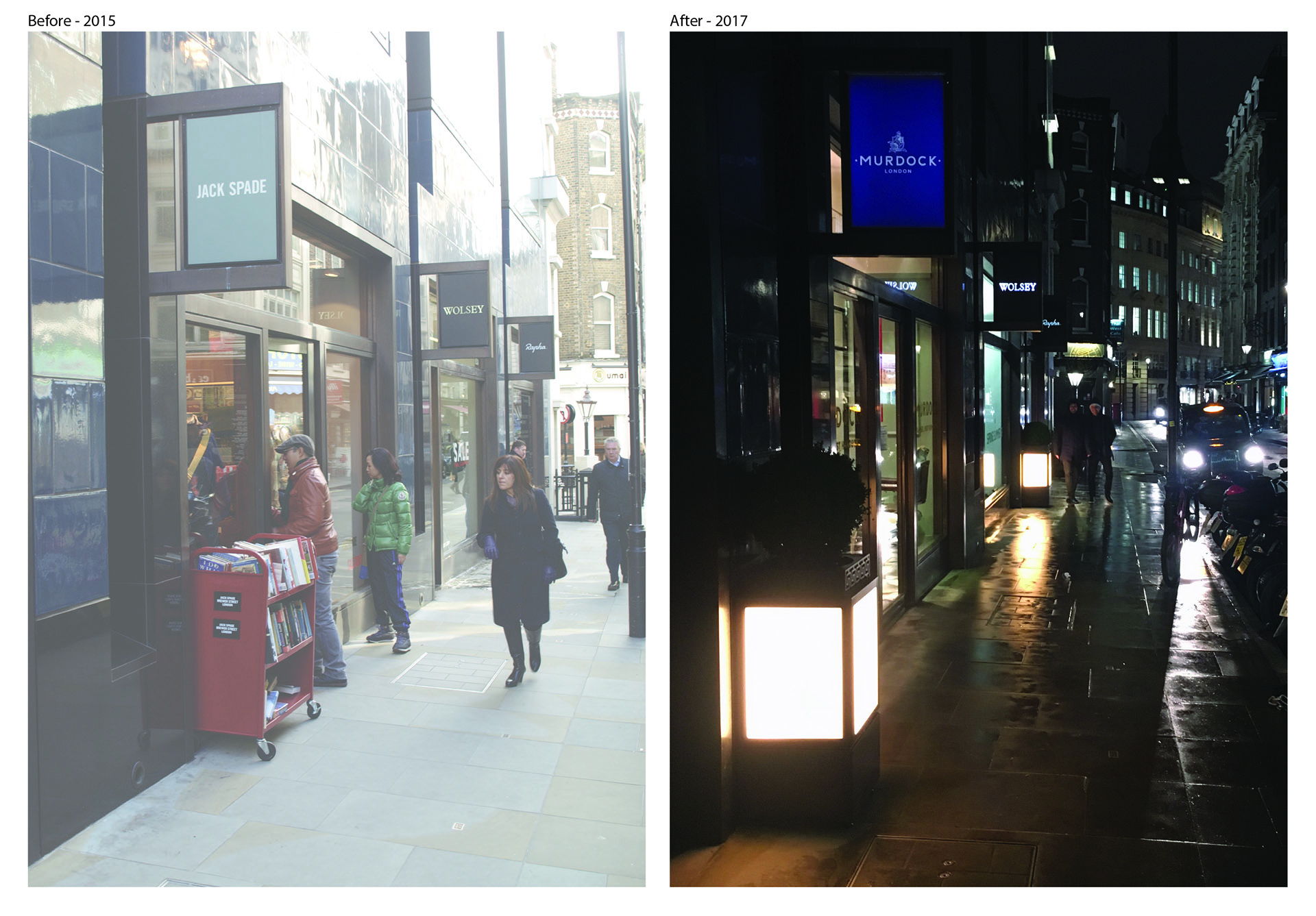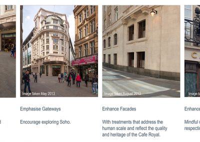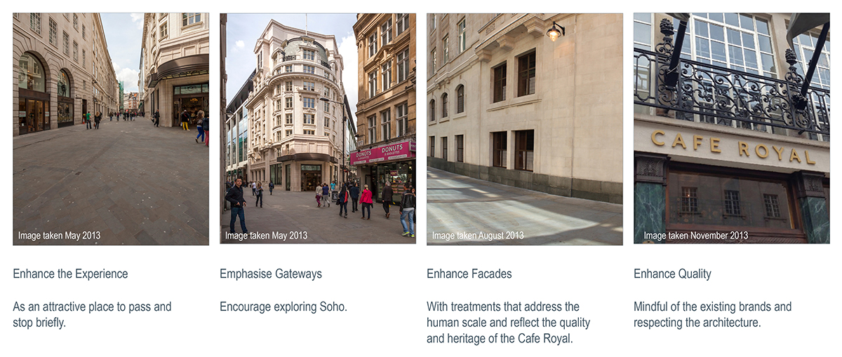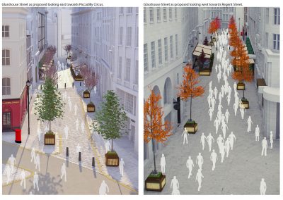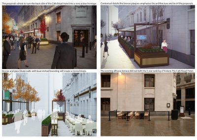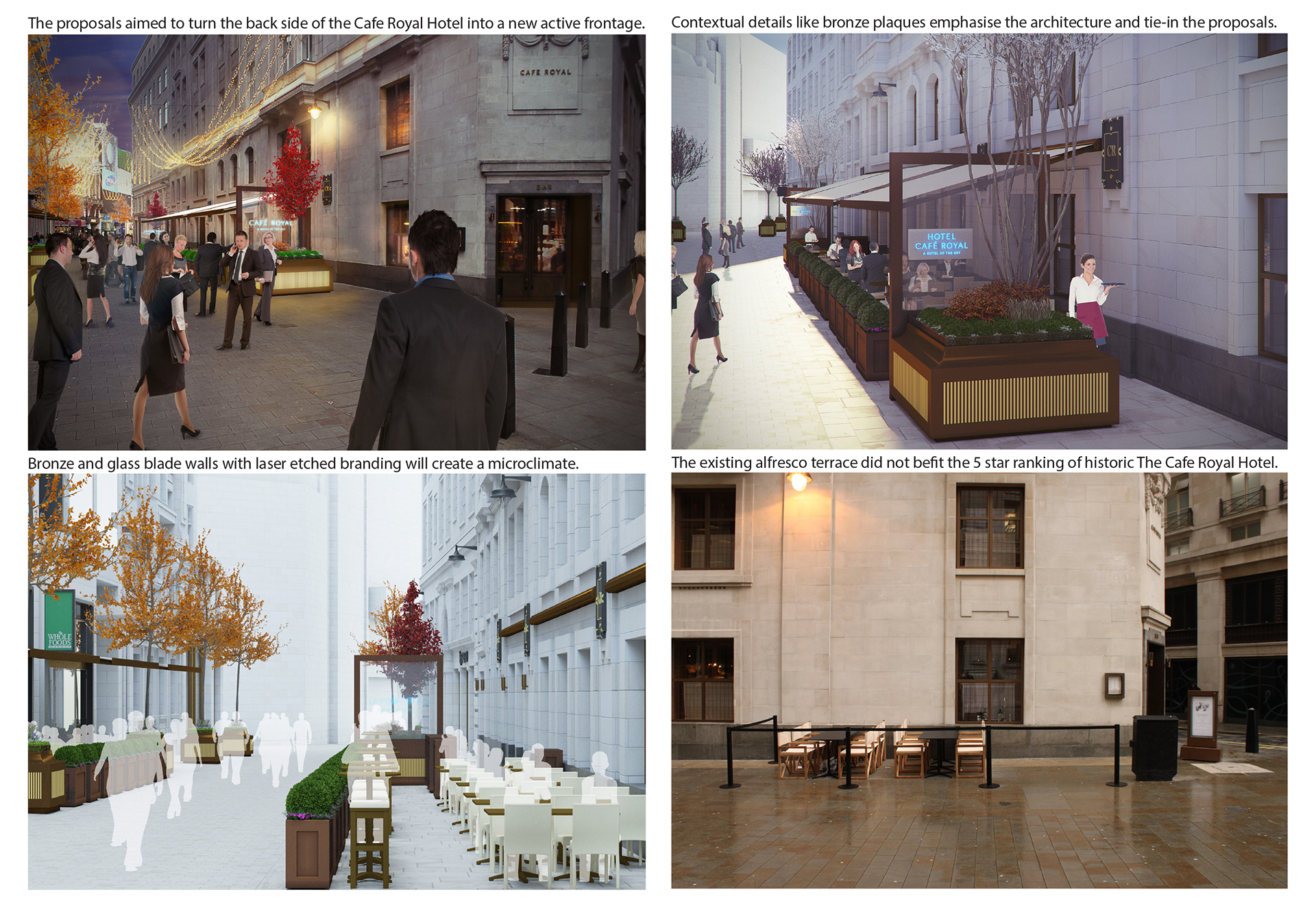 A comprehensive strategy resulting in a new pedestrian area for central London that features coordinated alfresco terraces for The Café Royal Hotel and Whole Foods Market as well as landscape animation initiatives for Glasshouse, Air and Brewer Streets, including innovative bronze and LED illuminated tree planters, larger garden planters, lazer etched glass blade walls and movable barrier planters. Iconic new London street furniture.