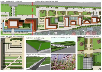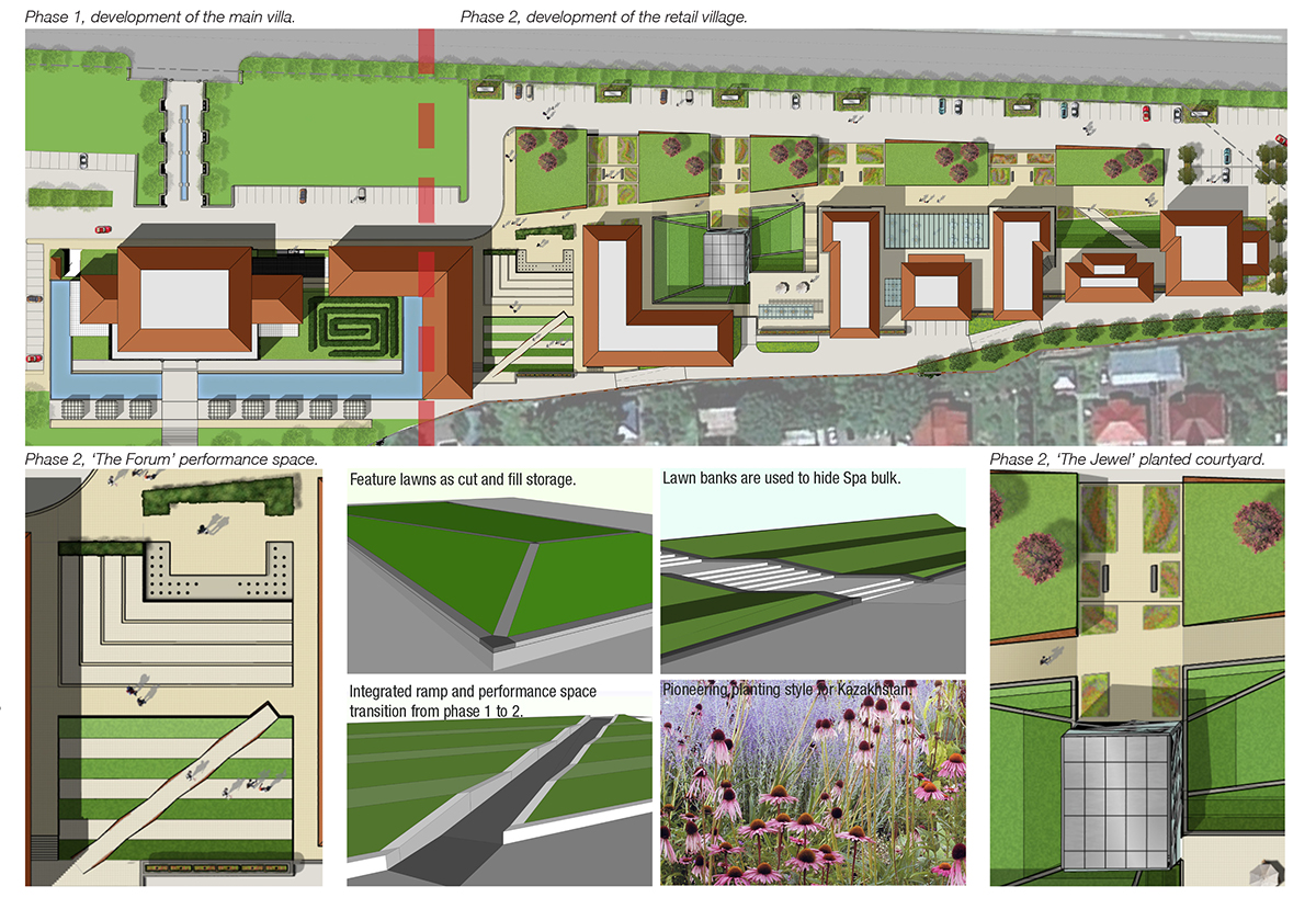 Villa dei Fiori is situated a half a kilometre from the Al Farabi Park Project and is located near the Essentai Park on Al Farabi Road, Almaty Kazakhstan. The first phase of the development was launched in May 2012 with a gala event attended by the great and good of Almaty. Strengths – Existing phase a high quality precedent. – Good site access. – Well connected to main Almaty districts. – Long site maximizes frontage. Weaknesses – Various site boundaries confine the site. – Large overall area requirement. – Views from the site are limited. Challenges – Climatic design considerations. – Integration with phase one. – Softening the overall mass. – Creating inward looking courtyards to supplement views. Creating a luxury shopping destination in the context of the above-mentioned constraints was achieved by taking a landscape led approach to the site layout and architectural treatment. Soft landscape, and in particular sculptured lawns have been used to disguise much of the bulk of the lower level Spa that sits above-ground. This approach has minimised the bulk of the architecture so phase 2 resembles the secondary structures that may accompany an Italian Villa. Stepped lawns and performance spaces also annimate the development and draw ultra high net worth individuals to all stores even in winter where covered routes and fires pits provide warmth. Also featured are mixed perennial borders, a style not seen before in Kazakhstan and fully researched for viability in that climate.