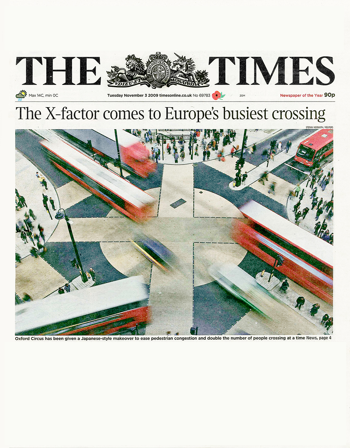 Oxford Circus is one of the most congested spaces in the country. It is used by over 43,000 people and 2,000 vehicles every hour, and forms part of 23 London bus routes. The stairways to the tube station at the corners of the circus are used by 230,000 people a day.